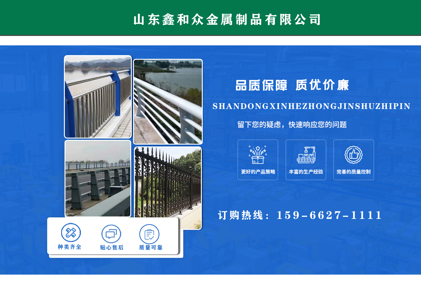 山東鑫和眾金屬制品有限公司主要產(chǎn)品有防撞護欄,橋梁護欄,道路護欄,河道護欄,不銹鋼護欄等護欄。提供設(shè)計方案,一站式定制,包您滿意價格優(yōu)惠,歡迎來電咨詢! 公司常年從事銷售護欄防撞護欄,橋梁護欄,道路護欄,河道護欄,不銹鋼護欄,橋梁鋼護欄,河道燈光護欄等。產(chǎn)品廣泛應用于橋梁、河道、旅游景區(qū)、道路、公路、公園、小區(qū)、景觀、道路防撞等領(lǐng)域。 公司產(chǎn)品均采用優(yōu)質(zhì)不銹鋼材料,符合相關(guān)標準。各種型號不銹鋼復合管及護欄,質(zhì)量嚴格把控。產(chǎn)品強度高、耐腐蝕、焊接牢固、抗沖擊、性能好,防撞護欄結(jié)構(gòu)簡單、美觀實用大方。 歡迎前來訂購!...
